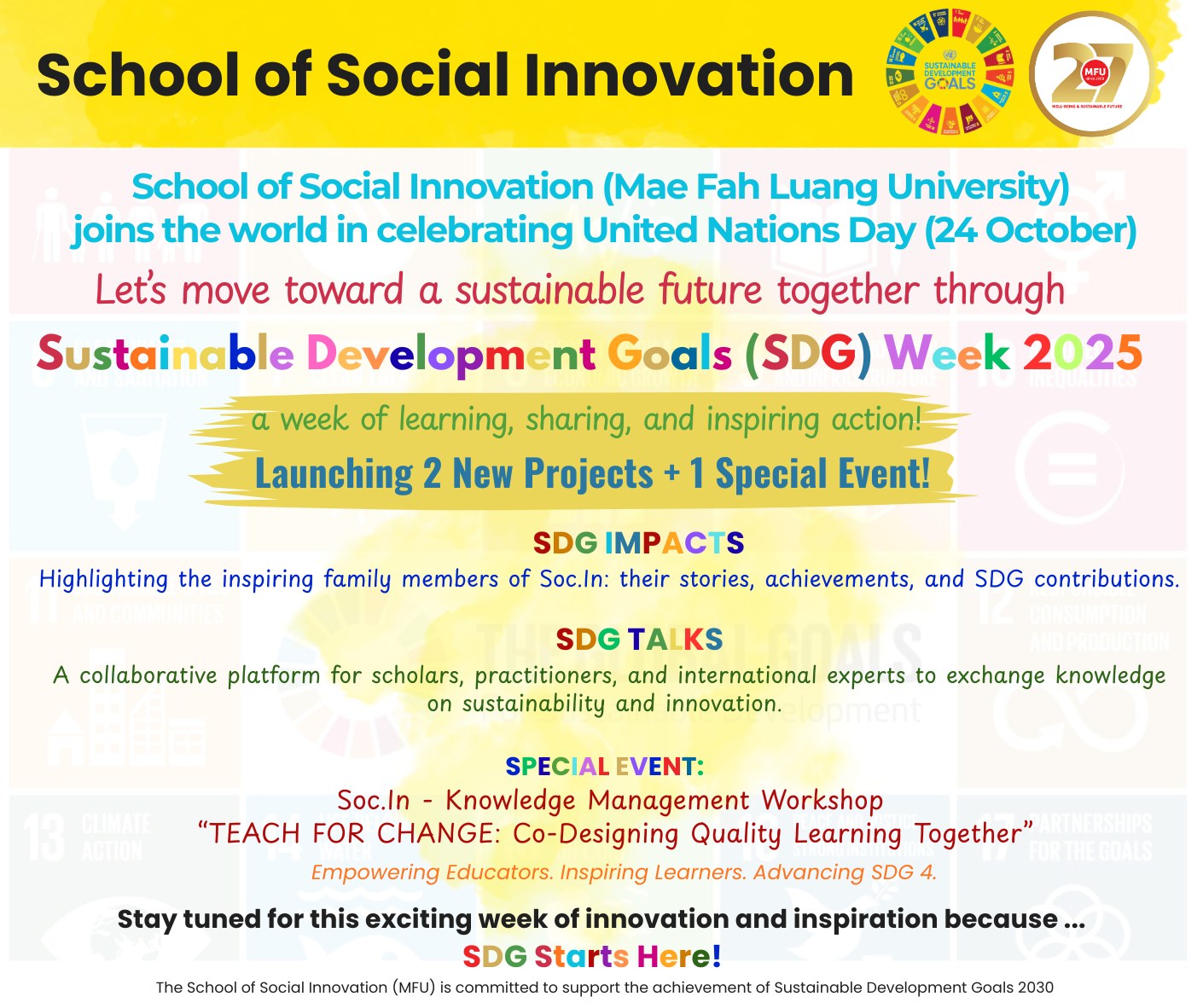 The School of Social Innovation (Mae Fah Luang University) proudly joins the world in celebrating United Nations Day (24 October) with an inspiring week of learning, sharing, and action — the Sustainable Development Goals (SDG) Week 2025!