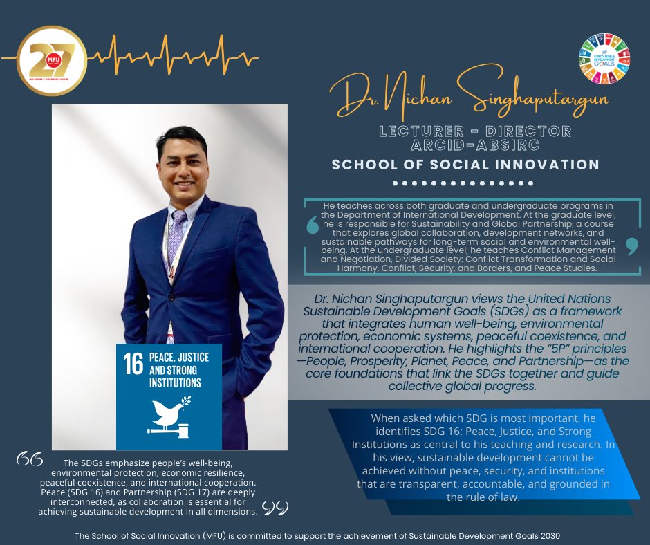 “SDGs เน้นความเป็นอยู่ที่ดีของผู้คน การคุ้มครองสิ่งแวดล้อม ความยืดหยุ่นทางเศรษฐกิจ การอยู่ร่วมกันอย่างสันติ และความร่วมมือระหว่างประเทศ สันติภาพ (SDG 16) และหุ้นส่วนความร่วมมือ (SDG 17) จึงมีความสำคัญอย่างยิ่ง เพราะความร่วมมือคือรากฐานของการพัฒนาที่ยั่งยืนในทุกมิติ”