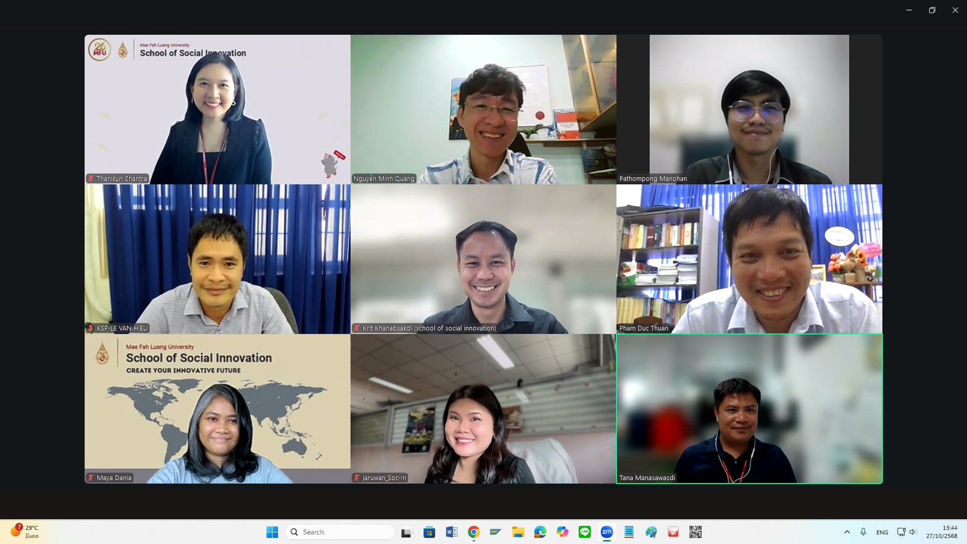 On October 27, 2025, the School of Social Innovation (SOC-IN), Mae Fah Luang University (MFU), and Can Tho University (CTU)—including Dr. Thanikun Chantra, Assistant. Prof. Pathompong Manohan, Aj. Krit Khanabsakdi, Asst. Prof. Maya Dania, Dr. Jaruwan Hatapasu, Dr. Nguyen Minh Quang, Assoc. Prof. Pham Duc Thuan and Dr. Le Van Hieu explored future collaborations in research, faculty & student exchange, and joint publications.
