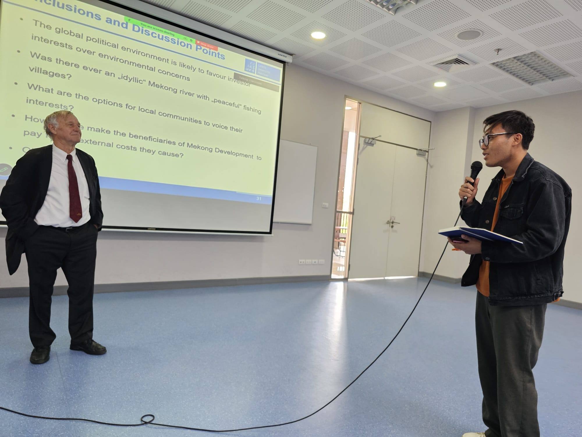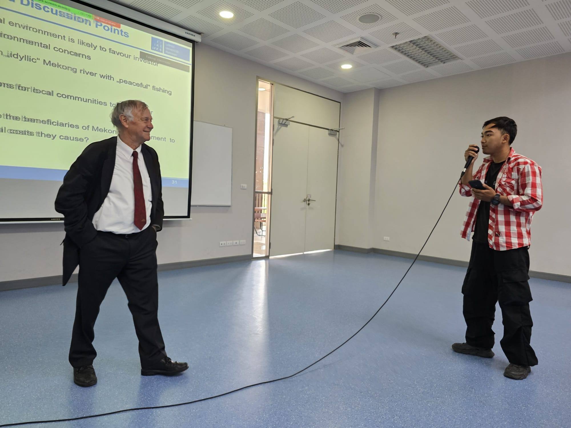 The special lecture was opened by the Dean of School of Social Innnovation, Asst. Prof. Dr. Thanikun Chantra. After that, Prof. Waibel presented preliminary findings from a comprehensive 2023 survey covering 110 villages located along the Mekong River across six countries. His research examines socioeconomic and environmental transformations over the past two decades, including the impacts of hydropower development, sand extraction, mining-related pollution, agricultural intensification, and climate change.